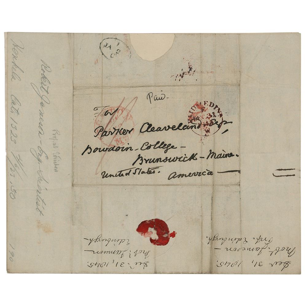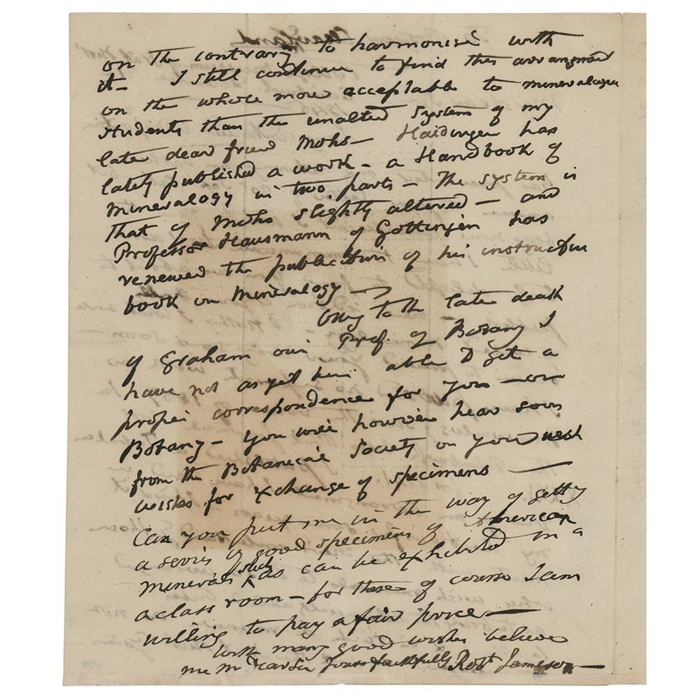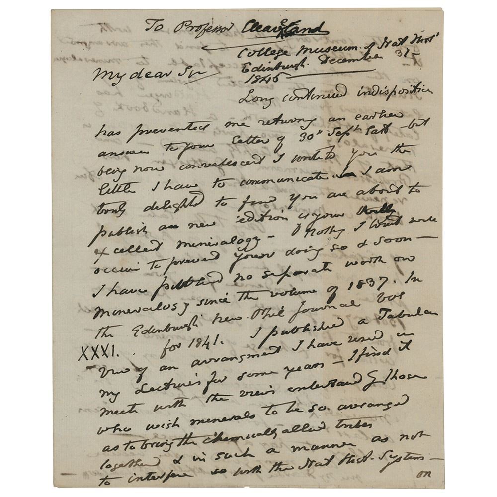 Scottish naturalist and mineralogist (1774–1854) remembered as a teacher of Charles Darwin and for building Great Britain's second-largest collection of zoological and geological specimens for the Museum of Edinburgh University. ALS signed “Rob't Jameson,†one page both sides, 7 x 8.75, December 31, 1845. Handwritten letter to American geologist Parker Cleaveland at Bowdoin College, discussing geological classifications systems. In part: "I am truly delighted to find you are about to publish a new edition of your…Mineralogy…I have published no separate work on minerals since the volume of 1837. In the Edinburgh New Phil. Journal Vol. XXXI for 1841, I published a tabular view of an arrangement I have used in my Lectures for some years…I still continue to find this arrangement on the whole more acceptable to mineralogical students than the unaltered system of my late dear friend Mohs—Haidinger has lately published a work, a Handbook of Mineralogy in two parts—the system is that of Mohs slightly altered." He goes on to request "good specimens of American minerals such as can be exhibited in a classroom." Addressed on the integral leaf in Jameson's hand. In fine condition, with slightly irregular light toning.