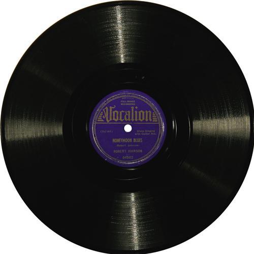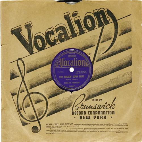 <B>Robert Johnson "Stop Breaking Down Blues"/ "Honeymoon Blues" 78 Vocalion 4002 (1938).</B></I> Recorded during the Dallas sessions in 1937, this became Johnson's 10th Vocalion release. Considered somewhere in the middle of the most and least scarce of Johnson's Vocalion 78s, it's estimated between 15 and 20 decent copies remain. Curiously, it's one we see less often than most, and the first one offered for a Heritage auction. It's a nice copy -- about as nice as you could hope for actually, since it plays about VG-EX 6. There is a small scratch at the very end of "Stop Breaking...", and there are a few pops, but that's practically a given with 68 year-old 78s!