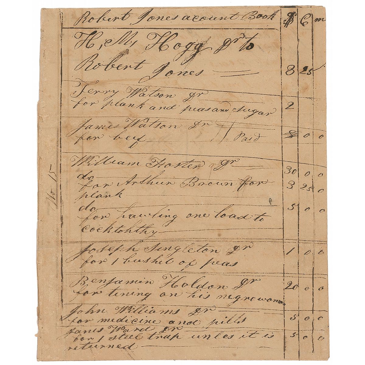 Manuscript ledger document headed “Robert Jones Account Book,” four pages on two adjoining sheets, 6.25 x 7.5, dated 1829. A ledger page accounting for various transactions, including the rental of slaves. In part (spelling and grammar retained): “William S…for the higher of 2 negro fellows february the 12—1829 at 12 Dollars pr month for the two which he promases to returne when cald for and the money when cald for.” Overall toning, scattered stray ink marks and brushes, and show-through from writing to opposing sides, otherwise fine condition.