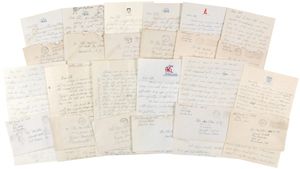 Extraordinary and unique archive of letters from Robert F. Kennedy to his close friend Peter MacLellan, comprised of 18 ALSs totaling 49 pages, spanning 1941–1945. Kennedy met and befriended MacLellan at the Portsmouth Priory School in Rhode Island, which Kennedy attended for eighth through tenth grades; MacLellan was a year ahead of him and the captain of three sports teams. As an aspiring athlete, Kennedy looked up to MacLellan and kept this continuing correspondence with him through the World War II years, many including content about football games. Also included in the archive are four telegrams from RFK, nine letters from Jean Kennedy (who MacLellan dated at one point), and one letter from Pat Kennedy. All letters include their original mailing envelopes, nearly all of which were filled out in Kennedy's hand and most including his name in the return address area. Almost all are signed either "Bob" or "Bobby," as well as one left unsigned, and single letters signed "Me," "Robert Francis," and compactly, "Robert Francis Kennedy." A sampling of the most interesting content follows:
