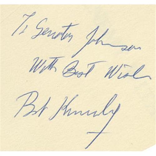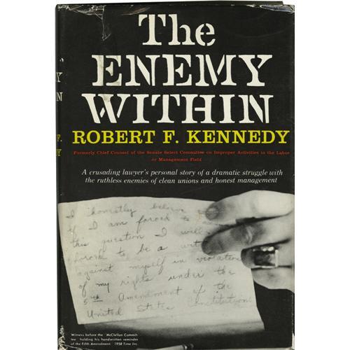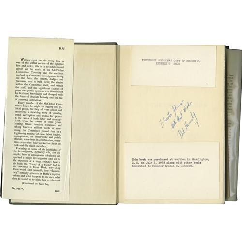 <B>Robert F. Kennedy Signed Book to Lyndon Johnson: <I>The Enemy Within</B></I></B></I> (New York: Harper & Brothers, 1960), first edition, xiv, 338 pages, green cloth with gilt, 8vo (6" x 8.5"), dust jacket, signed on the front free endpaper "<I>To Senator Johnson With Best Wishes Bob Kennedy</B></I>". This was Lyndon B. Johnson's personal copy of this book, and was originally purchased at auction in Washington, D.C. in 1963 along with other books inscribed to Johnson. There are two vintage 1960s clipped newspaper articles, about how Kennedy and Johnson didn't get along, tucked inside the back of the book . Good condition, a 2.5" tear on the front of the dust jacket has been repaired on the verso with old cellophane tape, as well as light edge wear, bottom book corners slightly bumped. Overall a nice copy with great historic association.