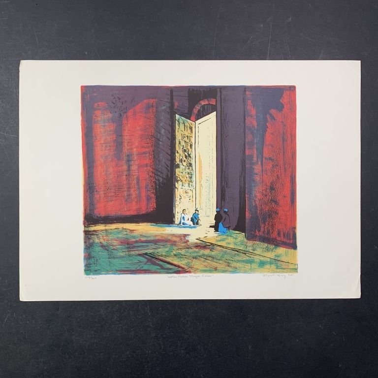 Robert King's "Sulton Hassan Mosque Cairo" Limited Edition Print. Several participants engage in prayer at the mosque. This piece is signed in the lower right, numbered 179/300 in the lower left and titled in the lower middle. It has dog-ears in three corners but does not affect the image and otherwise, it is in very good condition