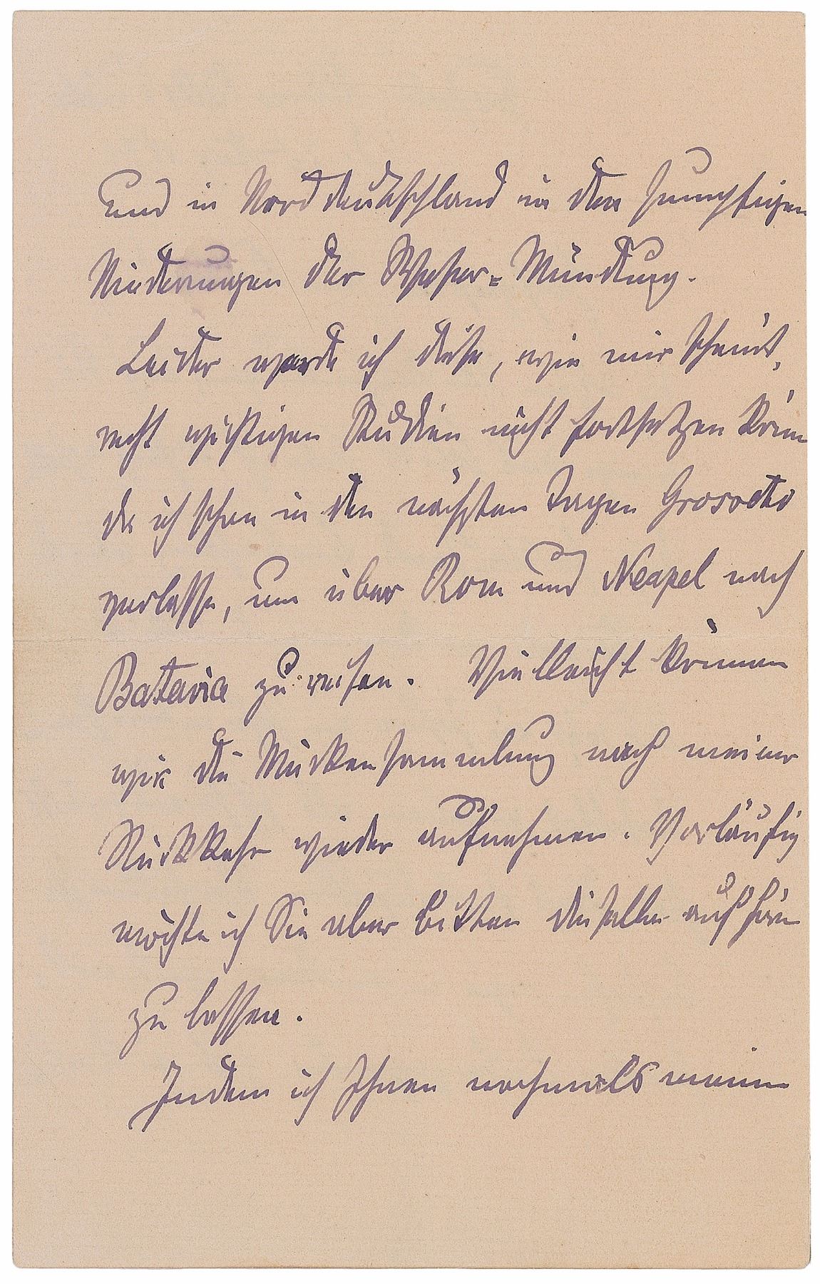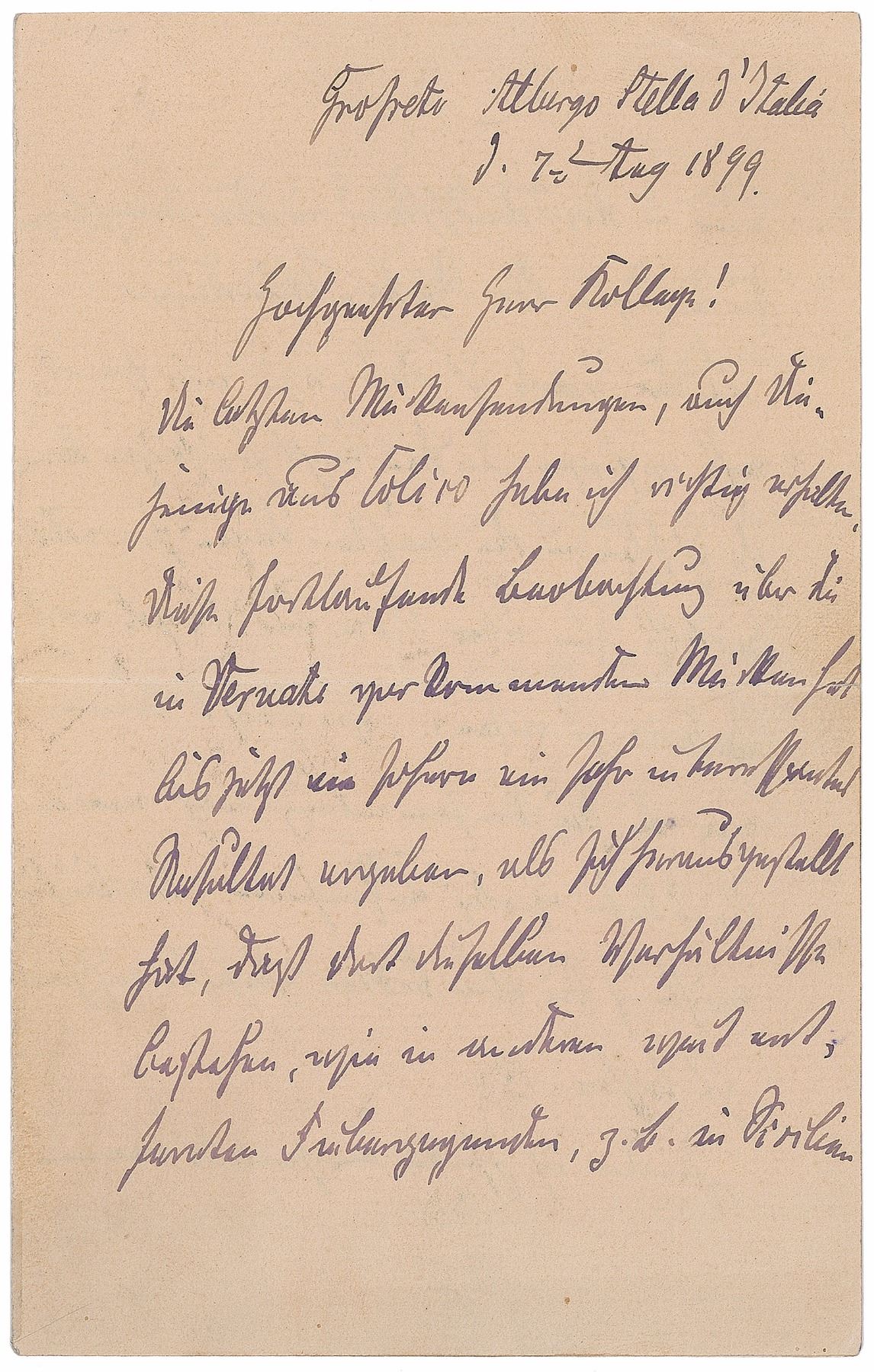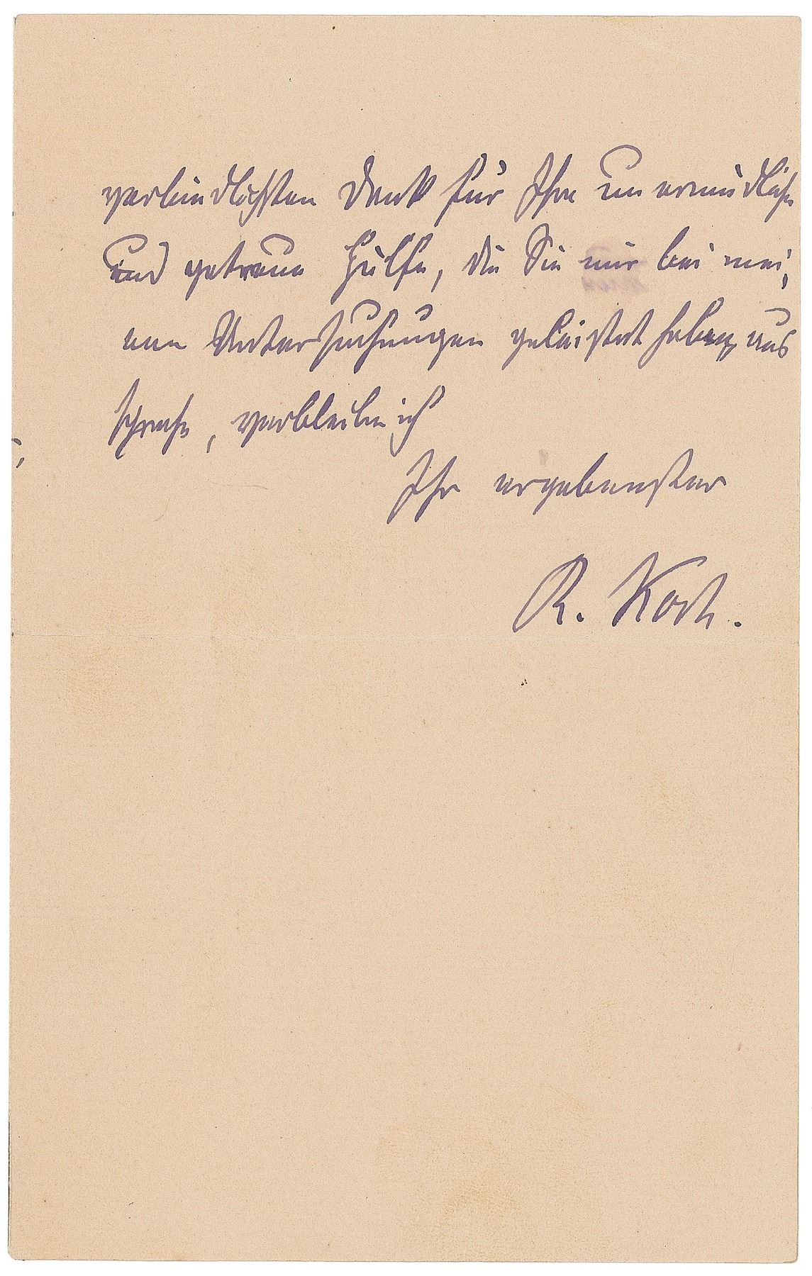 German medical scientist (1843–1910) regarded as the father of bacteriology. He isolated the tuberculosis bacillus and the anthrax virus, and received the Nobel Prize in physiology or medicine in 1905. ALS in German, signed "R. Koch," one page, 4.25 x 7, August 7, 1899. Letter to a young fellow, apparently Giovanni Galli, who regularly compiled mosquito deliveries for Koch's research. In part (translated): "The last parcels of mosquitoes, also the ones from Colico I received in good order. The continued monitoring of mosquitoes that appear in Vernato led into an interesting result. We found out that the same circumstances are existing like in other fever areas that are a long way away, like Szilia and in the northern part of Germany in the swamp areas of the Weser. Unfortunately I won't be able to continue my important studies as I have to leave in the next days from Grosseto to travel via Rome and Naples to Batavia. Maybe we can continue the mosquito collection upon my return again." In fine condition.