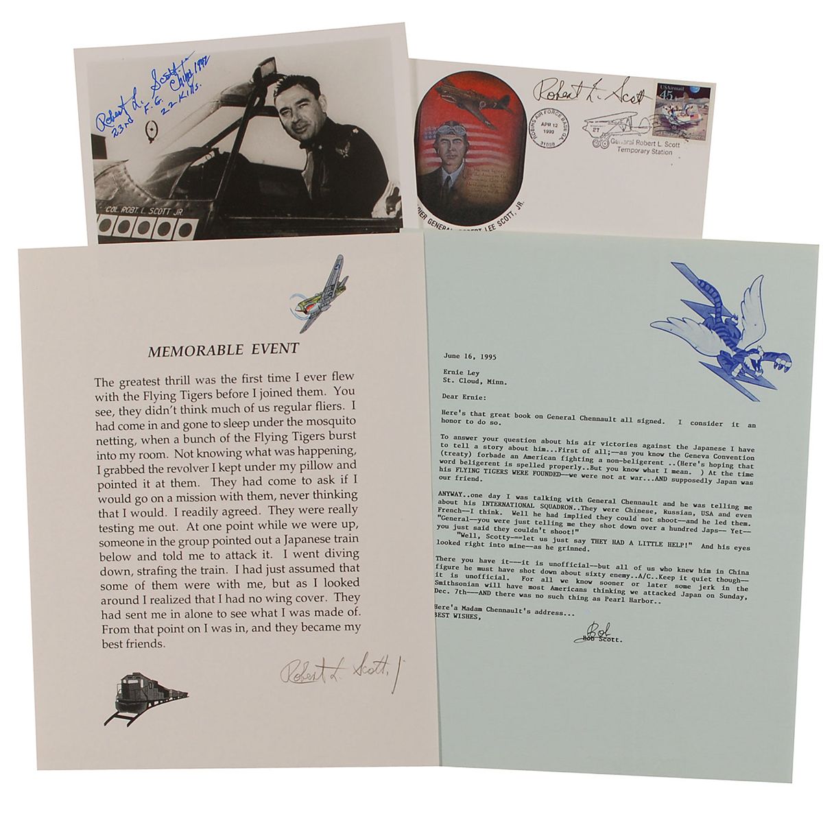 Collection of four items: TLS, signed “Bob,” one page, 8.5 x 11, June 16, 1995. In part; “At the time his [Chennault’s] Flying Tigers were founded—we were not at war…and supposedly Japan was our friend…One day I was talking with General Chennault and he was telling me about his International Squadron…Well he had implied they could not shoot—and he led them. ‘General—you were just telling me they shot down over a hundred Japs—Yet—you just said they couldn’t shoot!’ ‘Well, Scotty—let us just say they had a little help!’ And his eyes looked right into mine—and he grinned.”; a satin-finish 7 x 5 photo of Scott in his cockpit, signed in blue felt tip; a commemorative cover with a cachet honoring Scott, signed in black ink; and a printed testimonial of Scott’s most memorable event, one page, 8.5 x 11, signed in pencil. In fine condition.
