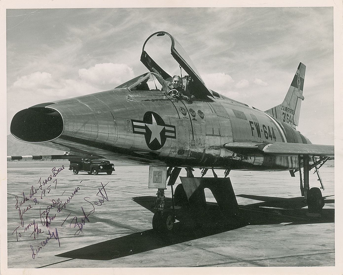 Brigadier general (1908–2006) in the United States Air Force and a flying ace of World War II, credited with shooting down 13 Japanese aircraft; he is widely remembered for his WWII memoir God is My Co-Pilot, about his time with the Flying Tigers. Vintage matte-finish 10 x 8 photo of Scott in the cockpit of a fighter plane, signed and inscribed in fountain pen, "Luke Air Force Base, June 3, 1957, To my friends—the Ken Brownes—Sincerely—Bob Scott.” Reverse bears an official "Air Force Photo" ink stamp. In very good to fine condition, with creasing to the corners, and a light paperclip impression to the bottom edge.