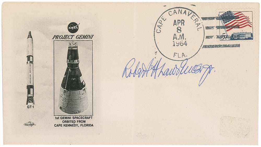 First African-American astronaut (1935–1967) who was killed in a crash of an F-104 Starfighter at Edwards Air Force Base. Rare commemorative cover with a cachet honoring Project Gemini, signed in blue ballpoint, “Robert H. Lawrence, Jr.” In fine condition, with some mild toning and a light pencil and adhesive remnant to bottom edge.