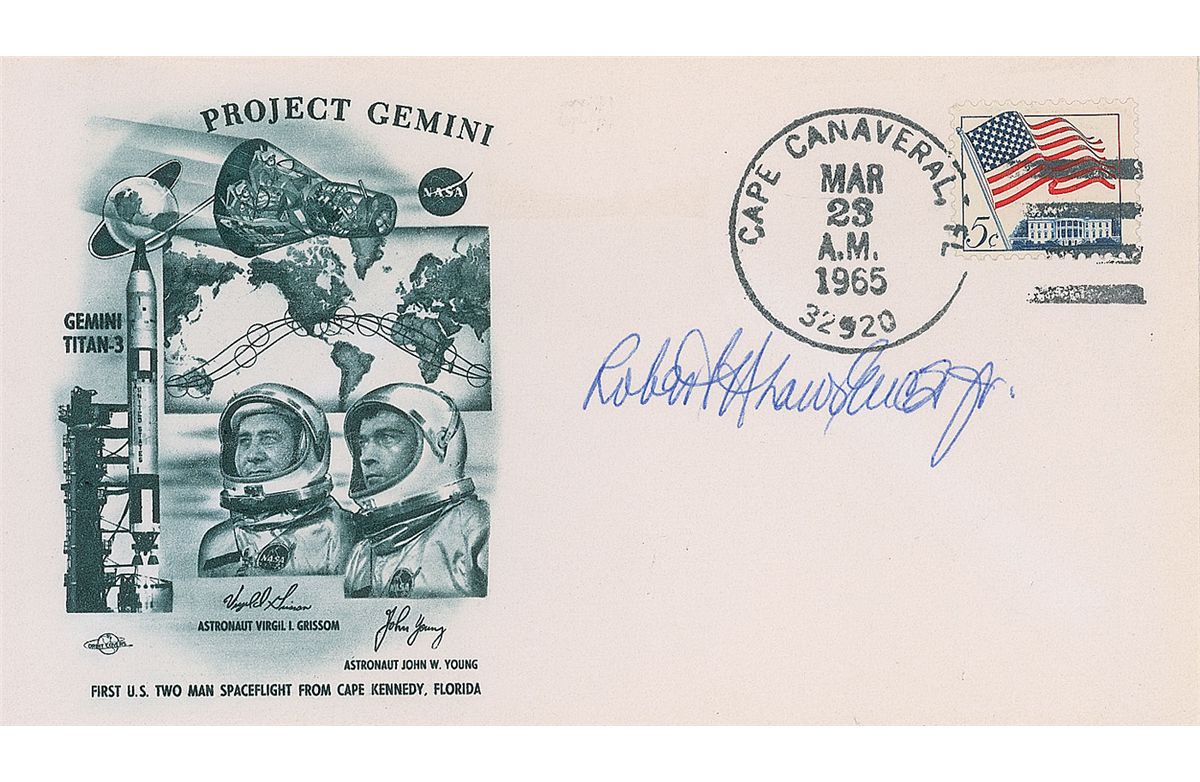 First African-American astronaut (1935–1967) who was killed in a crash of an F-104 Starfighter at Edwards Air Force Base. Scarce commemorative cover with a cachet honoring Project Gemini, signed in blue ballpoint, “Robert H. Lawrence, Jr.” In fine condition.