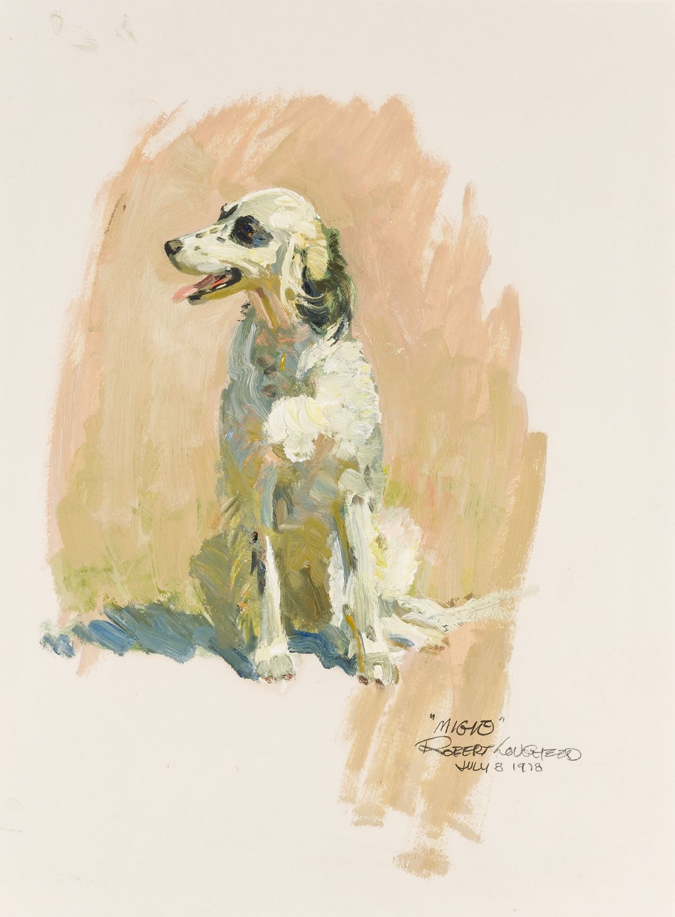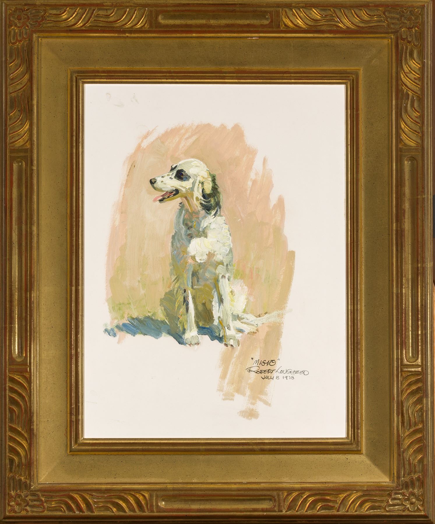 Condition details: This painting is in very good condition. With the unaided eye there are no issues. Closer inspection under ultraviolet light reveals normal fluorescence of artist's pigments, and no signs of restoration. The piece is framed in an ornate carved gold frame. The frame is in very good condition with normal wear. Verso: inscribed in artists’ hand: Daves pal “Migie” painted on the 8th day of July 1978 Robert Lougheed. Migie (Ramiga) Smith – wonderful dog and dear friend – born June 1968 – Boston MA died Sept. 9, 1978 – Los Alamos, NM. Brandi English Setter owned by Dave Smith.