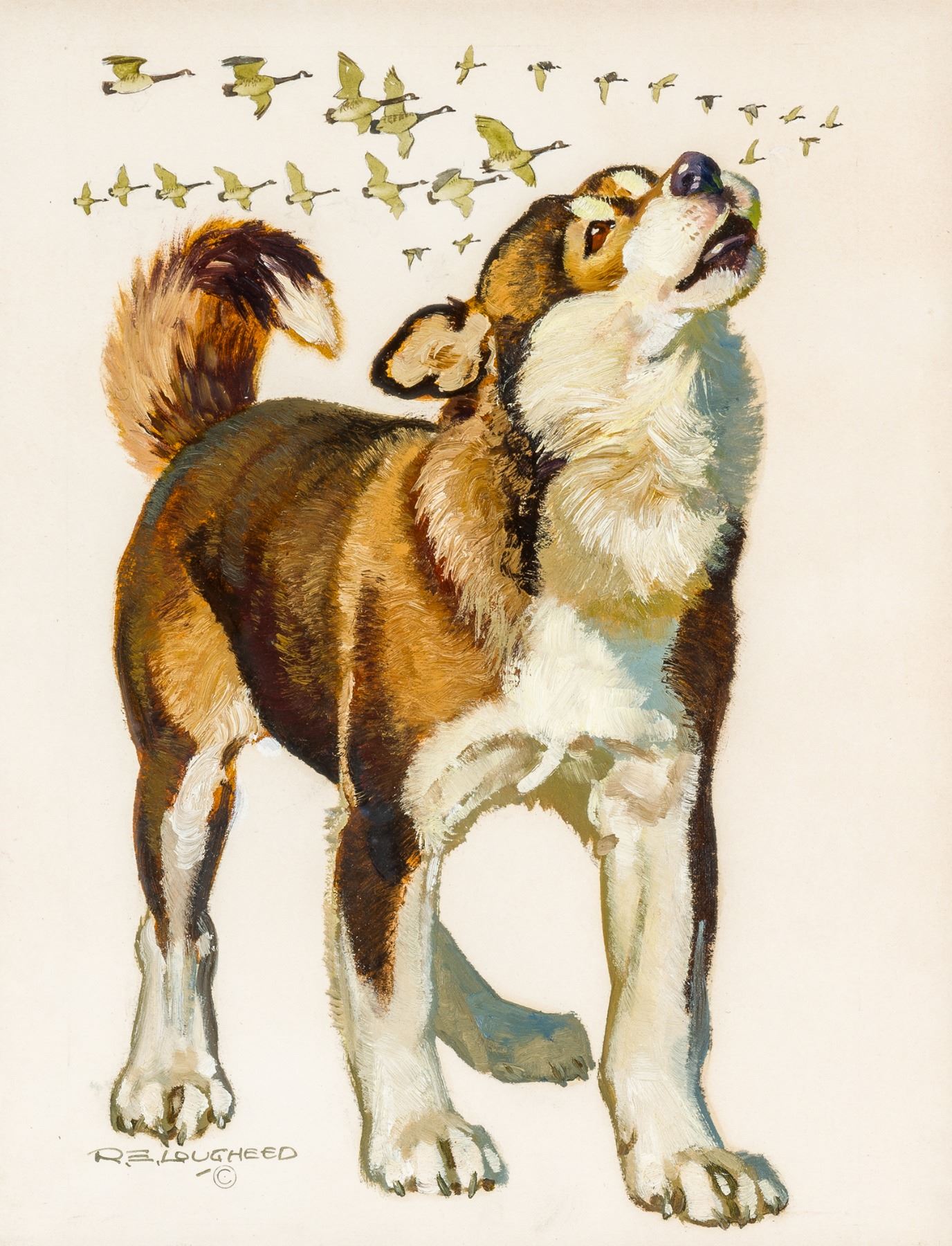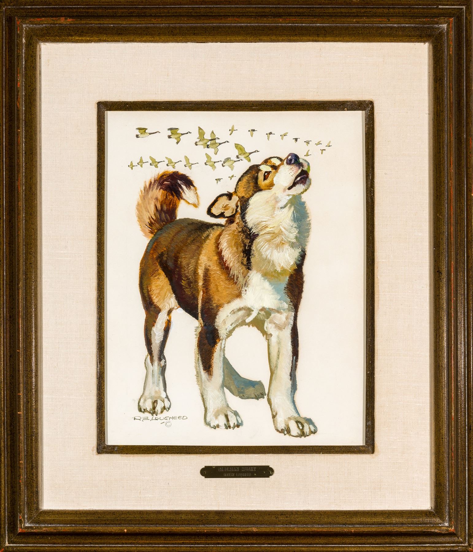 Condition details: This painting is in very good condition. With the unaided eye there are no issues. Closer inspection under ultraviolet light reveals 2 spots of inpainting in the lower left portion of the piece approximately ½ inch in size. These are not visible to the unaided eye. The work is mounted under glass and has not been inspected out of the frame. The piece is framed in a gold/brown frame with a linen liner and a gold/brown fillet. The frame is in very good condition with normal wear. Goldplate: Siberian Husky Robert Lougheed. Verso: label: Trailside Galleries. Stamped: artist reproduction rights.