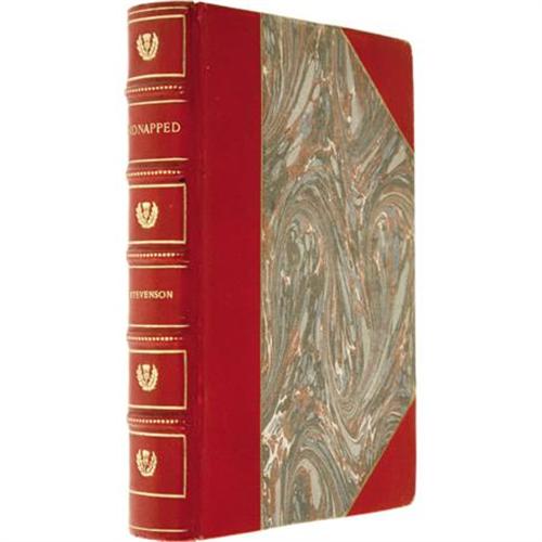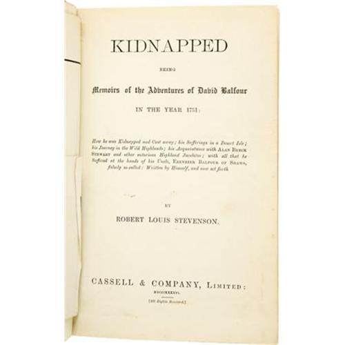 <B>Robert Louis Stevenson: <I>Kidnapped</B></I></B></I> <I>Being Memoirs of the Adventures of David Balfour in the Year 1751</B></I> (Cassell & Company, Limited, 1886), first edition, first issue, 311 pages, modern half-leather binding with marbled boards and gilt spine titles by Whitman Bennett of New York, 12mo (5" x 7.25"). This first issue of <I>Kidnapped</B></I> contains all three textual points consistent with the first issue, including: the word "business" at page 40, line 11; "nine o'clock" at page 64, line 1; and "Islands" at page 101, line 10. The advertisements for other Cassell imprints at rear dated "5G 4.86" and "5B 4.86" cannot be confirmed, as they were likely discarded upon the rebinding. The book is in very good condition, with rubbing to the boards and bumped corners. The textblock is incredibly clean, and includes the original fold-out map at the title page. A wonderful Stevenson first edition.<BR><BR><b>Shipping:</b> Books & Catalogs (<a target="_blank" href="http://www.heritageauctions.com/common/shipping.php">view shipping information</a>)
