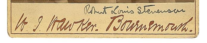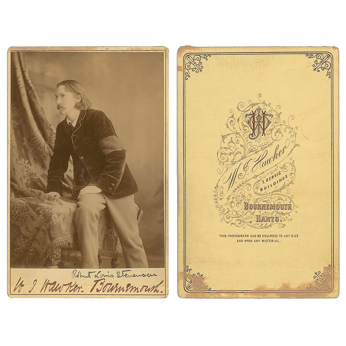 Exemplary 4.25 x 6.5 cabinet photo of Robert Louis Stevenson in a three-quarter-length pose by W. J. Hawker of Bournemouth, neatly signed on the mount in ink, "Robert Louis Stevenson." In very good to fine condition, with a hint of subtle silvering, a small surface bump near the top edge, and a circular postal impression to the left of Stevenson's image. Just the second signed photograph of Stevenson that we have offered, this marvelous portrait dates to circa 1886, when Stevenson was living in coastal Bournemouth, England, and writing the tale of Jekyll and Hyde. A superlative literary piece.