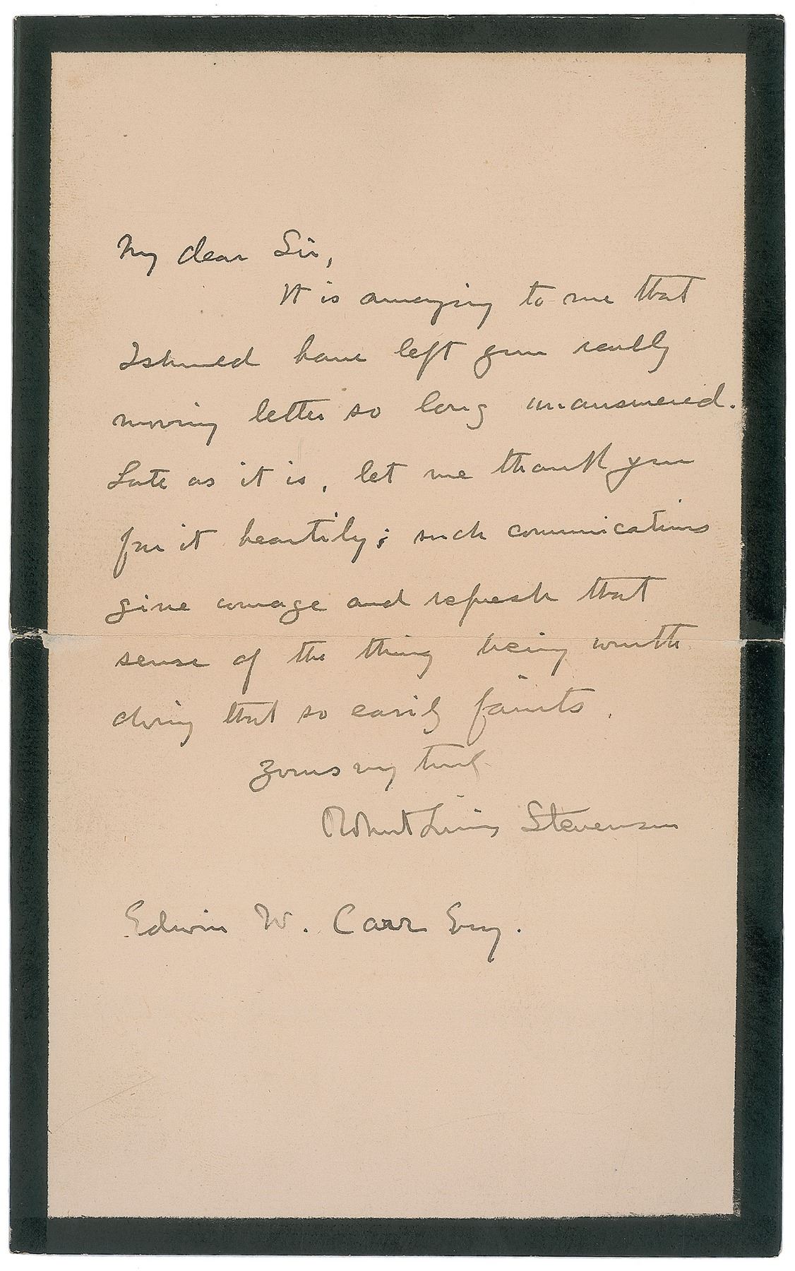 ALS, one page, 5 x 8, black-bordered mourning stationery, no date but circa 1887. Letter to Edwin W. Carr, in full: "It is annoying to me that I should have left your really moving letter so long unanswered. Late as it is, let me thank you for it heartily; such communications give courage and refresh that sense of the thing being worth doing that so easily faints." In fine condition, with a complete separation to the central horizontal fold repaired with tape on the reverse. Accompanied by the original mailing envelope addressed in Stevenson's hand, affixed to the front pastedown of an 1887 hardcover edition of Stevenson's Virginibus Puerisque and Other Papers. Stevenson's father passed away on May 8, 1887, thus the black-bordered letter, and he himself was battling tuberculosis he had suffered from since childhood—an affliction he often referred to as the 'wolverine on my shoulders.' Carr collected books and was fighting against the same disease in the dry air of Montana and passed away in 1893, a year before Stevenson's death.