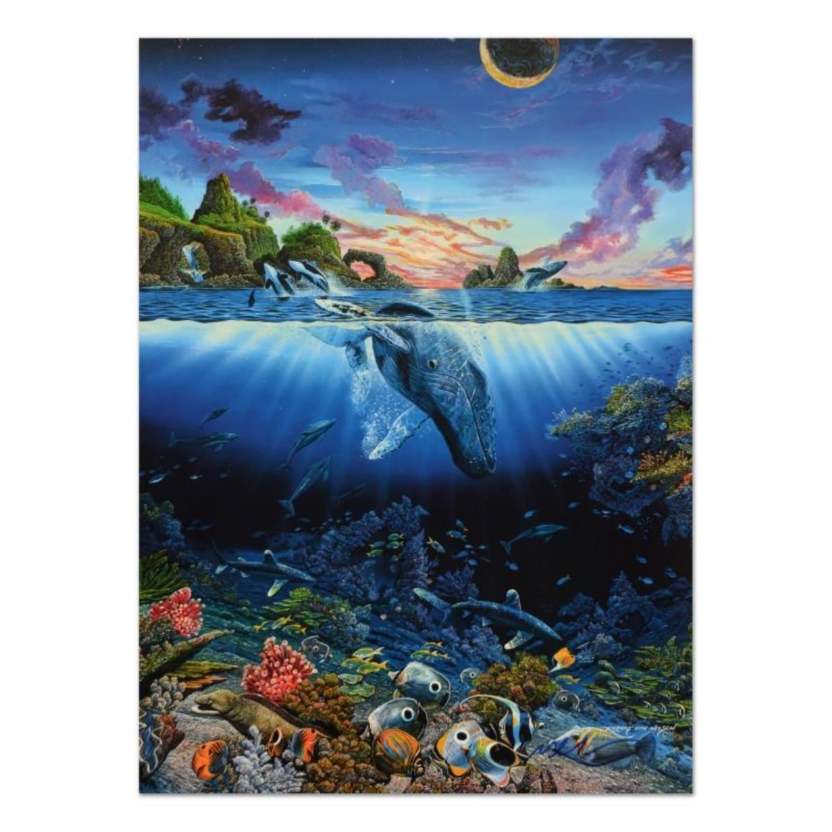 "Three Worlds" is a lithograph on paper, hand signed by the artist. Measures approx. 18" x 24" (image).