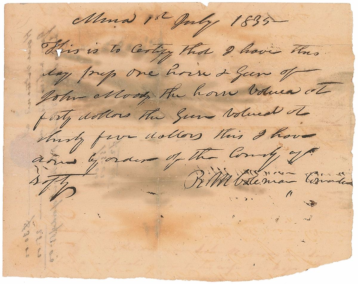 Indian fighter, soldier at the battle of San Jacinto, and signer of the Texas Declaration of Independence (1799–1837). Manuscript DS, signed “R. M. Coleman,” one page, 7.5 x 6, July 1, 1835. Receipt denoting the values of “one horse & gun of John Moody.” In very good condition, with intersecting folds, chipping and tears to edges, and significant overall staining. Provenance: The Robert Davis Collection.