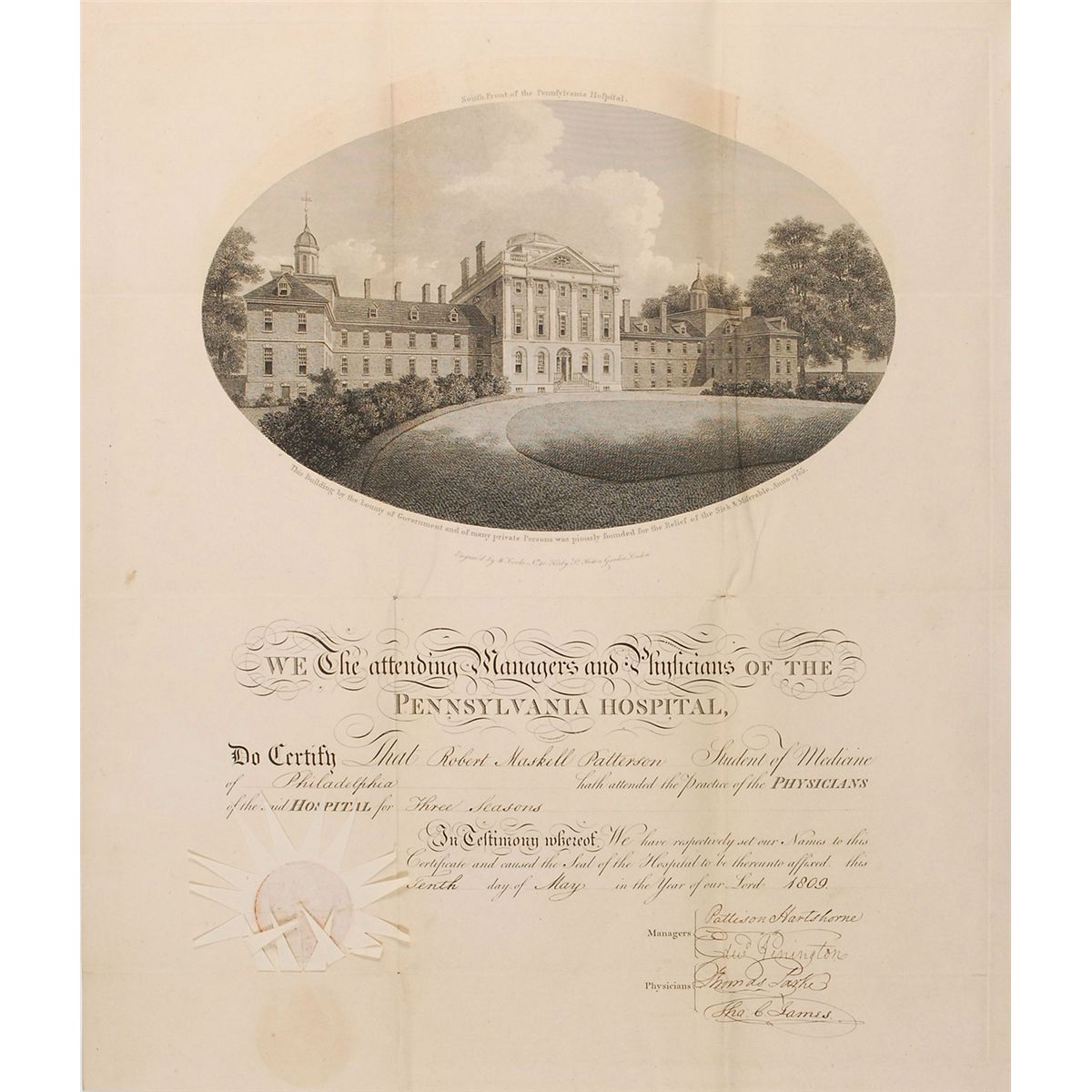 Professor (1787–1854) at the University of Pennsylvania, director of the US Mint, and cryptology enthusiast who frequently exchanged coded messages with Thomas Jefferson. Partly-printed DS issued to Patterson, signed by two managers and two physicians of the Pennsylvania Hospital, one page, 19 x 22, May 10, 1809. Document certifying “that Robert Maskell Patterson, Student of Medicine of Philadelphia hath attended the practice of the Physicians of the Hospital for Three Seasons.” The document features a gorgeous engraving of the hospital and retains its paper seal affixed to the lower left. In fine condition, with intersecting folds (small separations at intersections repaired with tape to reverse).