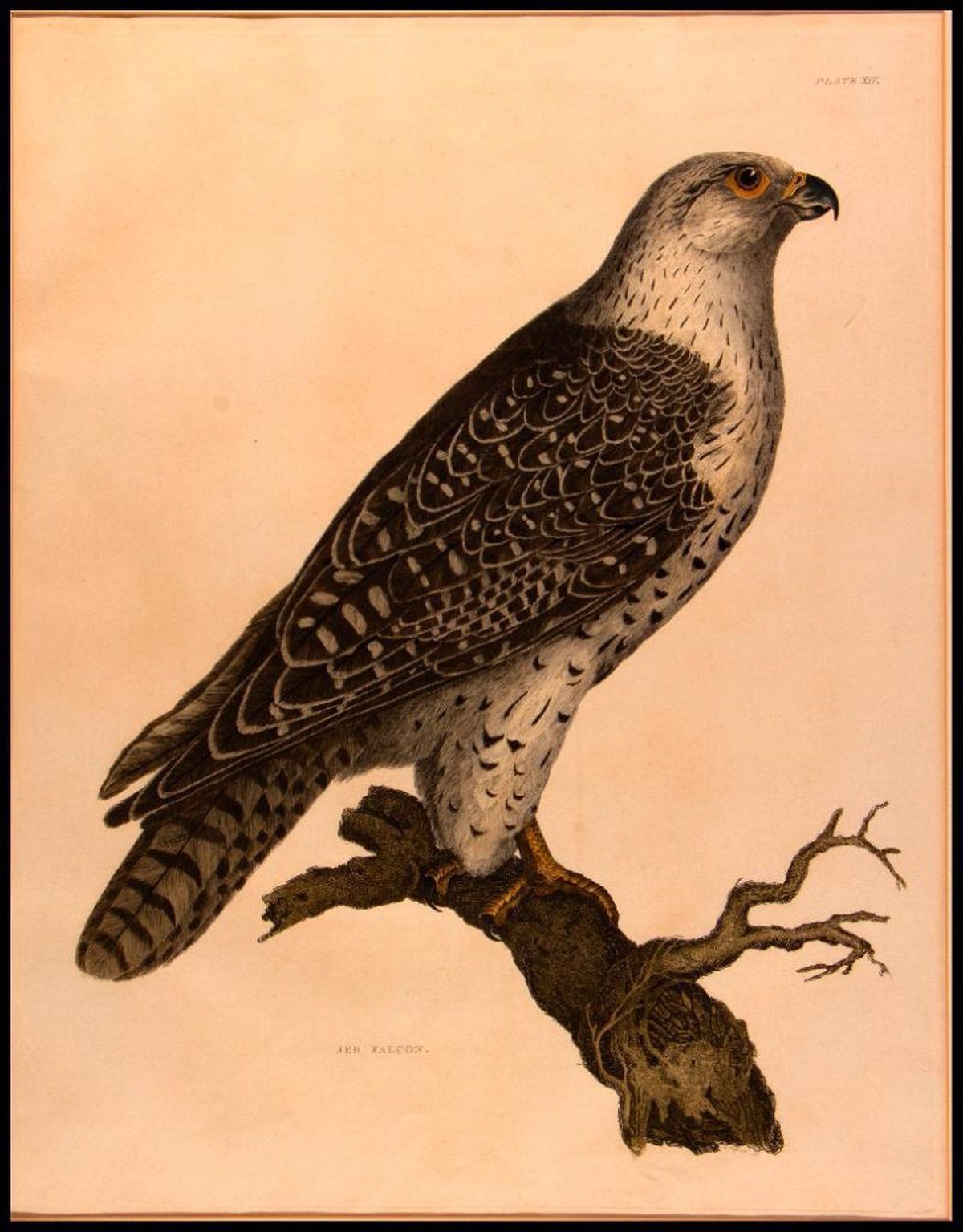 Artist: Robert MITFORD (1781-1870). Title/Subject: Jer Falcon", from Illustrations of British Ornithology. Signature: signed in plate. Medium: engraving. plate 14. Size image: 22 x 17 in. Size frame: 30 x 24 in. Created: 1821-34. Condition: toning to paper.
