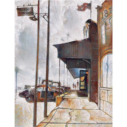 Robert MacDonald Graham (American, b. 1919), "Hot Day in Aledo (Texas)", c. 1981; oil/canvas, 24" x 18", signed and titled on verso. Missouri regionalist painter. He studied with Thomas Hart Benton at the Kansas City Art Institute. He exhibited at the M