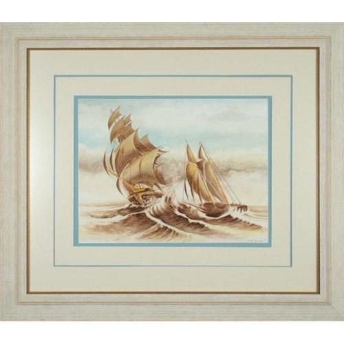 This is an excellent original maritime watercolor. It shows all the attention to detail, free flowing of color, and control of the medium that has made MacIsaac?s work so distinguishable. Typical to his style the water in this painting tremendously rendered, this is one of his trademarks. The almost monochromatic style of this painting is broken by the light blue of the sky. The work has a fantastic white washed wood frame and a double mat. The frame is exquisite ornate wood and the mat is a cream color with an under mat of light sky blue, there is also a v-groove in the top mat that shows the blue mat through, a beautiful matting job. It is in perfect condition and signed.
