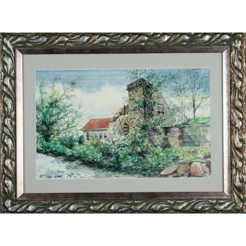 The Millbarn is a orignial watercolor created in 1978 by the celebrated Michigan watercolorist Robert MacIssac. It is a rich composition showing a Millbarn surrounded by nature. This is an orginal, signed work that is in excellent condition 26"x 20" . It is matted with a soft gray mat and framed in a silver finished wood frame that is modern and beautiful. Robert MacIsaac was born in Detroit, Michigan in October of 1925 where he began to foster his significant artist talent. He spent much of his professional career in Novi, MI where he gained recognition for his beautiful landscapes and maritime activities of Michigan . He was also a renowned graphic designer. His work can still be viewed in the seal of the city of Novi. Robert was a decorated World War II veteran and produced many exemplary and vivid pieces up to his death in Clearwater, FL in December of 2000. A letter of provenance is provided.