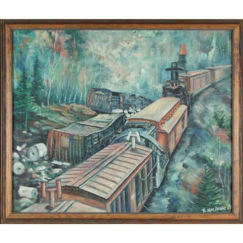 Fantastic oil on panel painting created by MacIsaac in 1971. Signed and dated. Moody image of a train wreck with sublime colors. An active composition with rich paint and detail. Robert MacIssac, a celebrated Michigan painter uses his talent to create wonderful active plein air works. This unique composition brings the viewer's eye into the painting. The work is in great condition and is framed in a excellent medium oak frame. Robert Mac Isaac was born in Detroit, Michigan in October of 1925 where he began to foster his significant artist talent. He spent much of his professional career in Novi, MI where he gained recognition for his beautiful landscapes and maritime activities of Michigan . He was also a renowned graphic designer. His work can still be viewed in the seal of the city of Novi. Robert was a decorated World War II veteran and produced many exemplary and vivid pieces up to his death in Clearwater, FL in December of 2000.