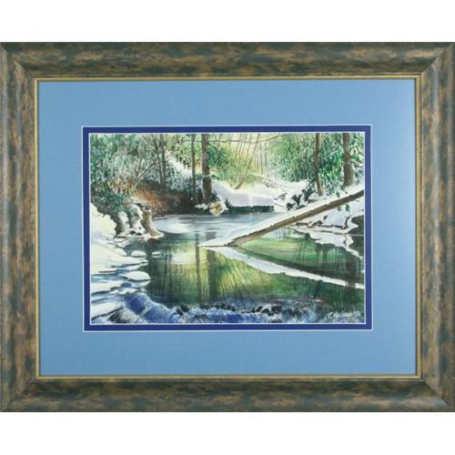 Winter River is a wonderfully detailed watercolor done in the realist manner. Created by celebrated Michigan artist Robert MacIssac in 1975. This work shows a snowy river with a downed tree. It has vivid colors of green and blue creating a very festive composition. A master of realism, MacIssac paints a beautiful natural scene in this work. It has two rich blue mats. A top mat of blue gray brings out colors in the snow, the navy bottom mat creates depth. The frame is contemporary with marbled gold and brown accents. It fits the work perfectly. The total size is 70 x 85 cm. Robert MacIsaac was born in Detroit, Michigan in October of 1925 where he began to foster his significant artist talent. He spent much of his professional career in Novi, MI where he gained recognition for his beautiful landscapes and maritime activities of Michigan . He was also a renowned graphic designer. His work can still be viewed in the seal of the city of Novi. Robert was a decorated World War II veteran and produced many exemplary and vivid pieces up to his death in Clearwater, FL in December of 2000. A letter of provenance is provided.