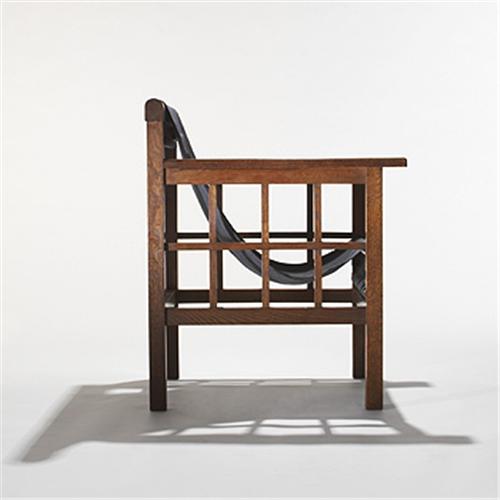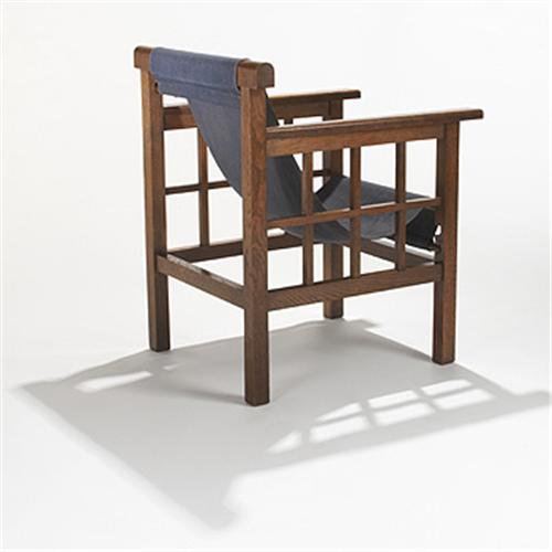 This chair was one of three examples commissioned directly from Robert Mallet-Stevens by the painter Albert Dequenne (1897-1973) for his house in northern France. The massive oak frame features a canvas sling that can be adjusted in two positions. Sold with a certificate of authenticity from Antoine Delerive who acquired the chair directly from Dequenne.