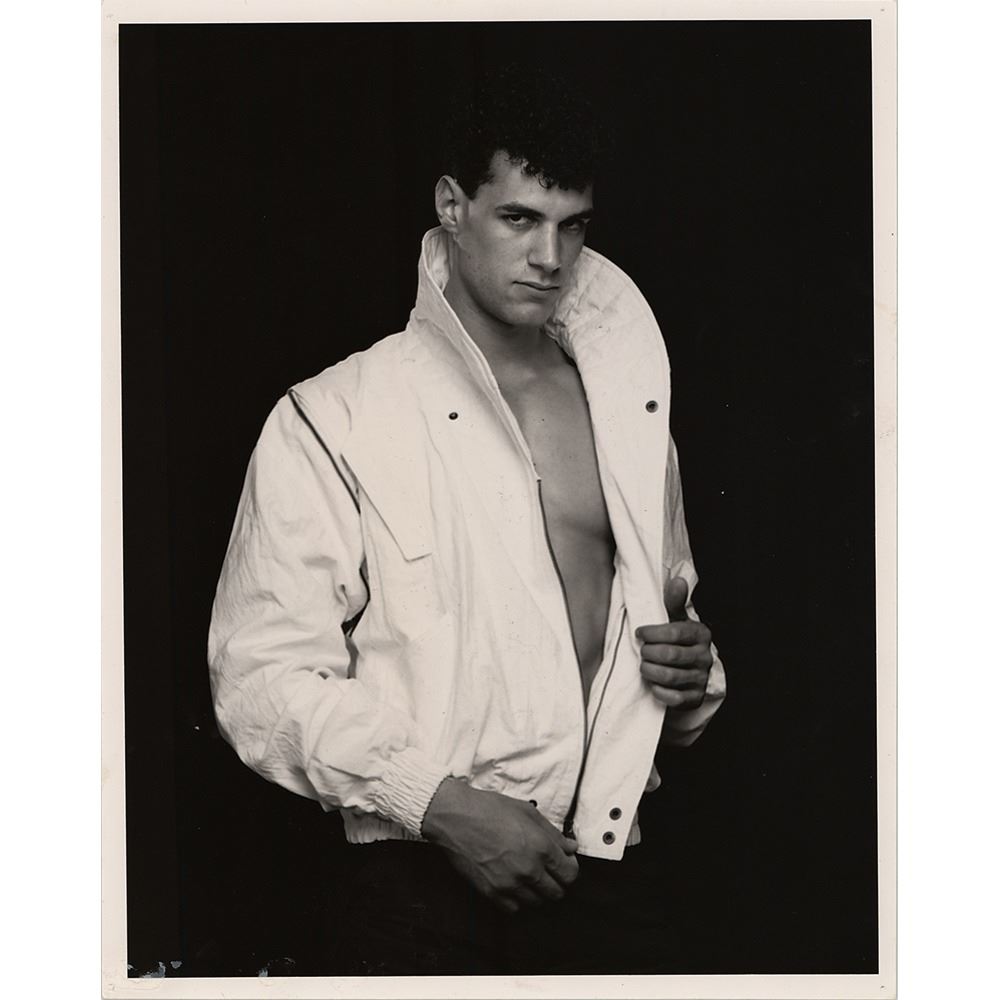 Original satin-finish 8 x 10 photo of Mapplethorpe's famous 'torso' model Charles, taken by Robert Mapplethorpe during the iconic 'Charles Torso 1985' sessions, showing the model in unzipping a white jacket. In fine condition, with a couple light surface creases and some adhesive residue to lower left. Consignor notes that this originates from the personal collection of Charles, and was given to Charles by Mapplethorpe at his 23rd Street studio between 5th and 6th Avenues in 1985.