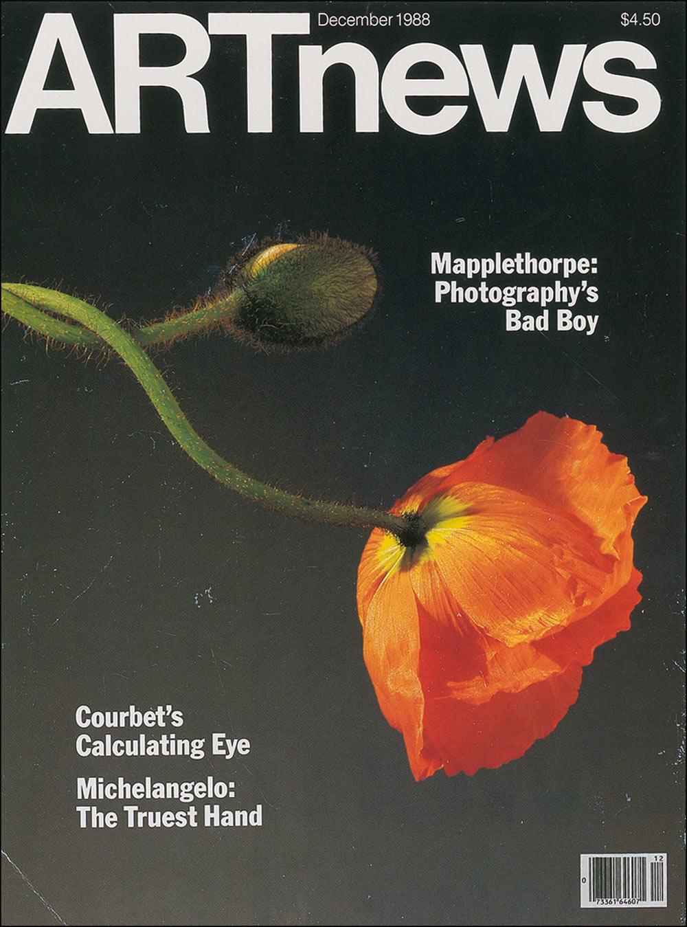 Photographer (1946-1989), known for his large, highly stylized, and at times controversial black-and-white portraits. The eroticism of some of his creations triggered controversy over the public funding of artworks. ARTnews magazine front cover, dated December 1988, signed on the reverse in blue ink by Robert Mapplethorpe. In fine condition, with bends and creases along the bottom.