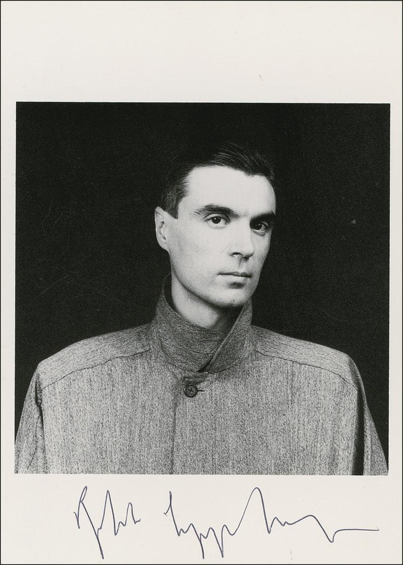 Photographer (1946-1989), known for his large-scale, highly stylized black and white portraits, photos of flowers and naked men. The frank, homosexual eroticism of some of the work of his middle period triggered a more general controversy about the public funding of artworks. Interesting 4.25 x 6 postcard photo of Talking Heads front man David Byrne, signed in the lower border in black ink. In fine condition. RRAuction COA.