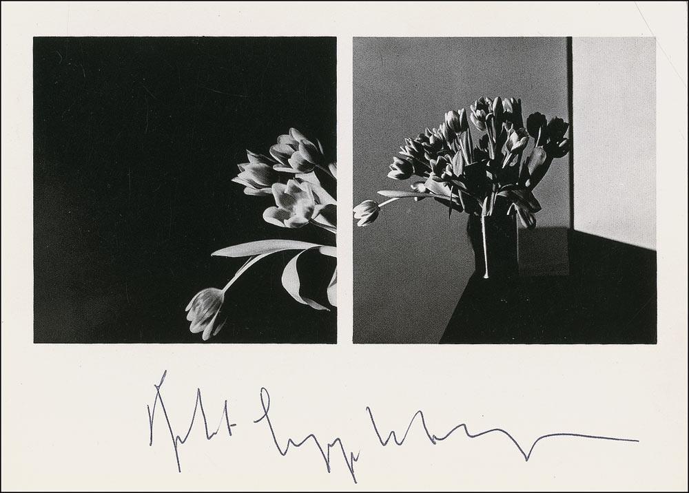 Photographer (1946-1989), known for his large, highly stylized, and at times controversial black-and-white portraits. The eroticism of some of his creations triggered controversy over the public funding of artworks. Sedate 6 x 4.25 postcard photo of his portrait, ‘Tulips,’ signed in black ballpoint beneath the image. In fine condition. Mapplethorpe’s signature is very uncommon.