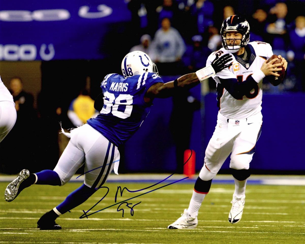 Robert Mathis signed Indianapolis Colts chasing Peyton Manning action 8x10 photo. Item comes with a Schwartz Sports Memorabilia tamper-proof numbered hologram and Certificate of Authenticity which can be verified online.