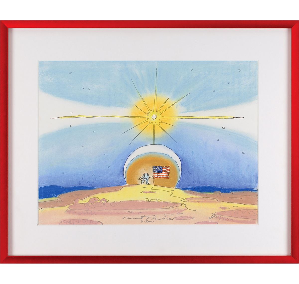Inspiring original ink and pastel drawing by artist Robert McCall, 11.75 x 8.75, depicting an astronaut holding a flag on the lunar surface, signed in black ink, “Robert T. McCall,” adding the date below, “6. 2007.” Matted and framed to an overall size of 16 x 13. In fine condition.