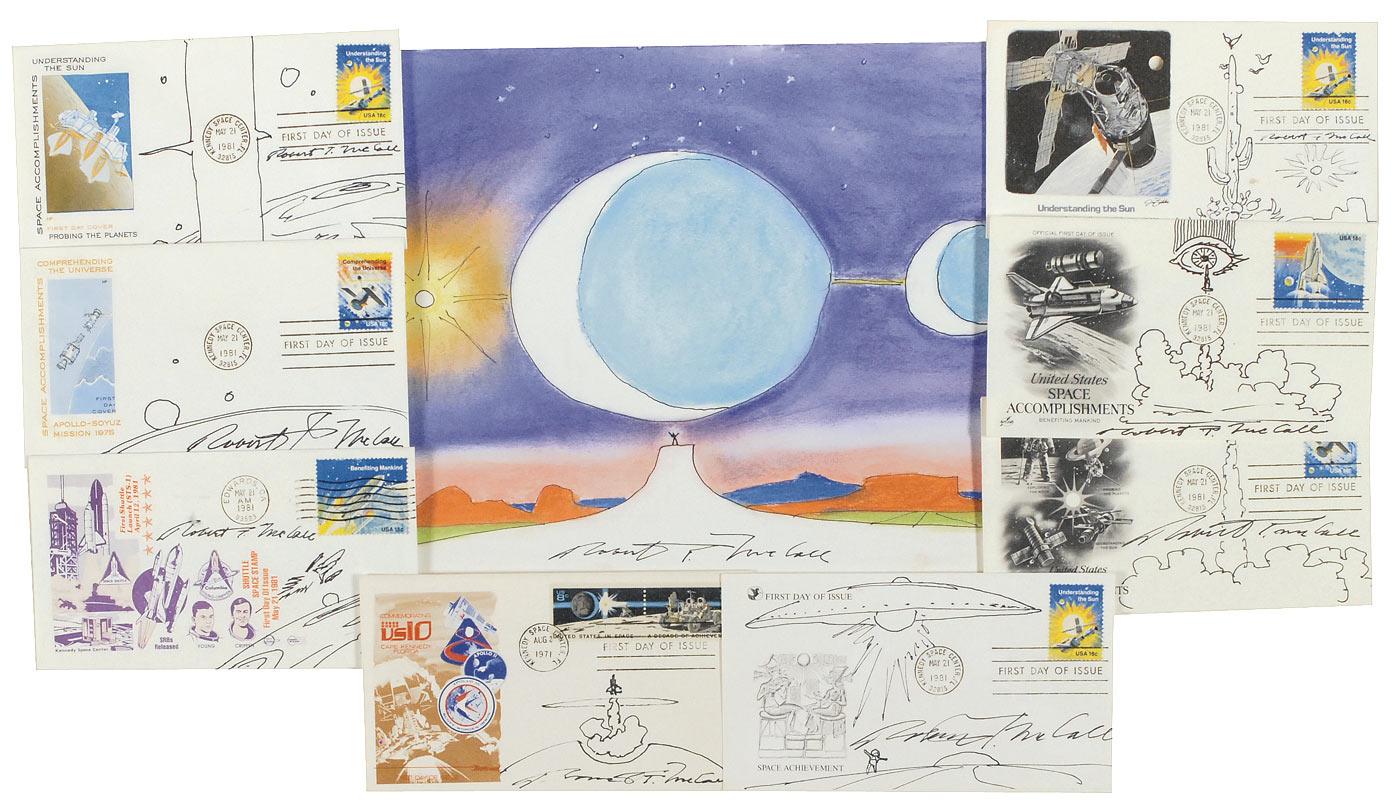Nine items: eight interesting original ink sketches on various FDCs and commemorative covers; and a beautiful color pastel sketch of a lone figure on a celestial landscape on a 12 x 9 card, signed at the bottom in black ink by McCall.