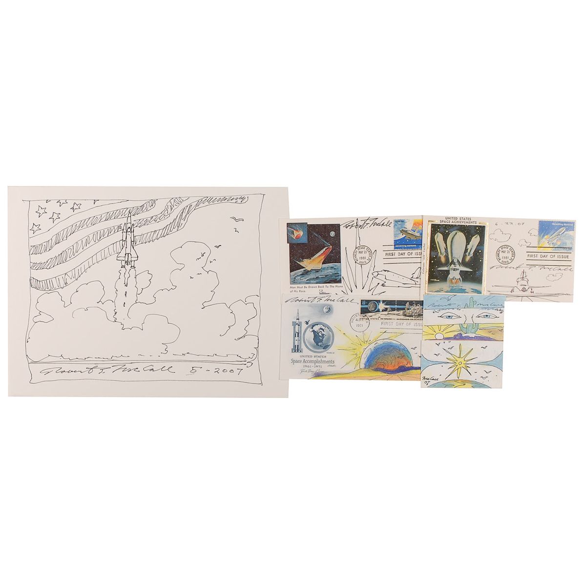 Five items: two original sketches on individual FDCs, signed in black ink; a 9 x 12 ink sketch of a shuttle launch, signed in black ink, “Robert T. McCall, 5–2007”; and two 3.5 x 2 color drawings on the back of two of McCall’s business cards, signed in black ink. In fine condition.