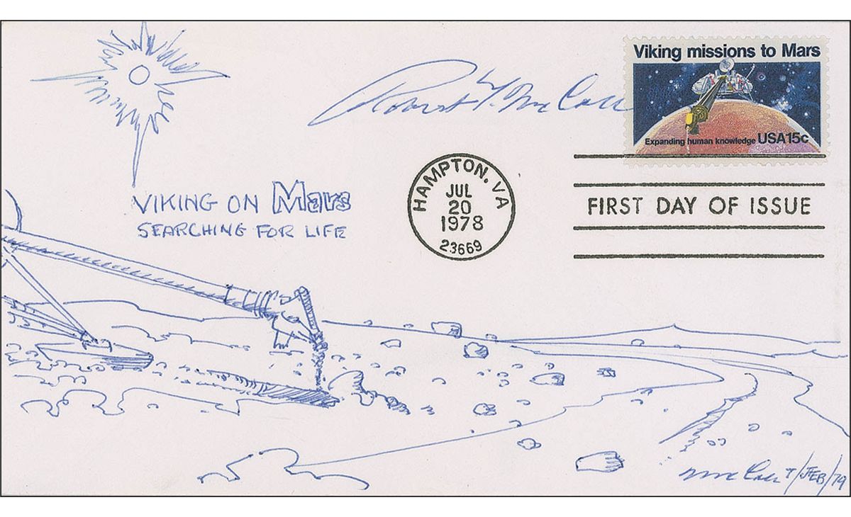 Original blue ballpoint sketch of the Viking spacecraft collecting a sample, entitled ‘Viking on Mars: Searching for Life’ on a First Day Cover, signed, “Robert T. McCall.” In fine condition.