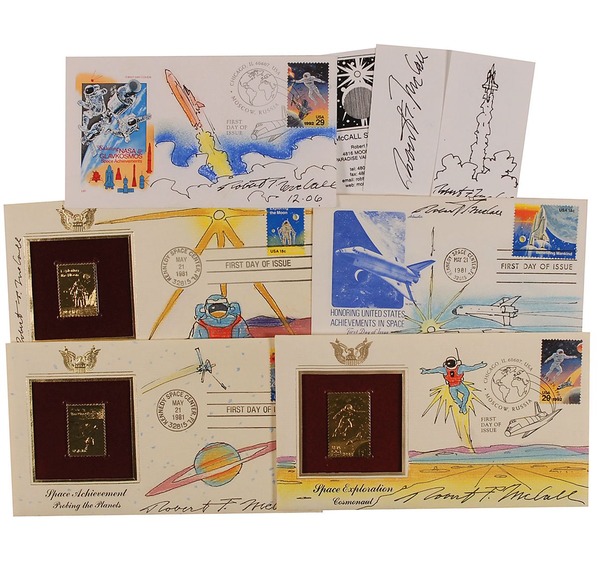 Six original signed pastel and/or ink sketches: five on individual FDCs, each featuring different commemorative cachets, ranging in size from 6.5 x 3.5 to 7.5 x 4.25, each signed in black ink, “Robert T. McCall.” Scenes include shuttle flights, celestial bodies, and astronauts; one ink sketch of a shuttle launch on the reverse of one of McCall’s business cards; and an ink signature on the reverse of another business card. In fine condition. Accompanied by an unsigned personal business card.