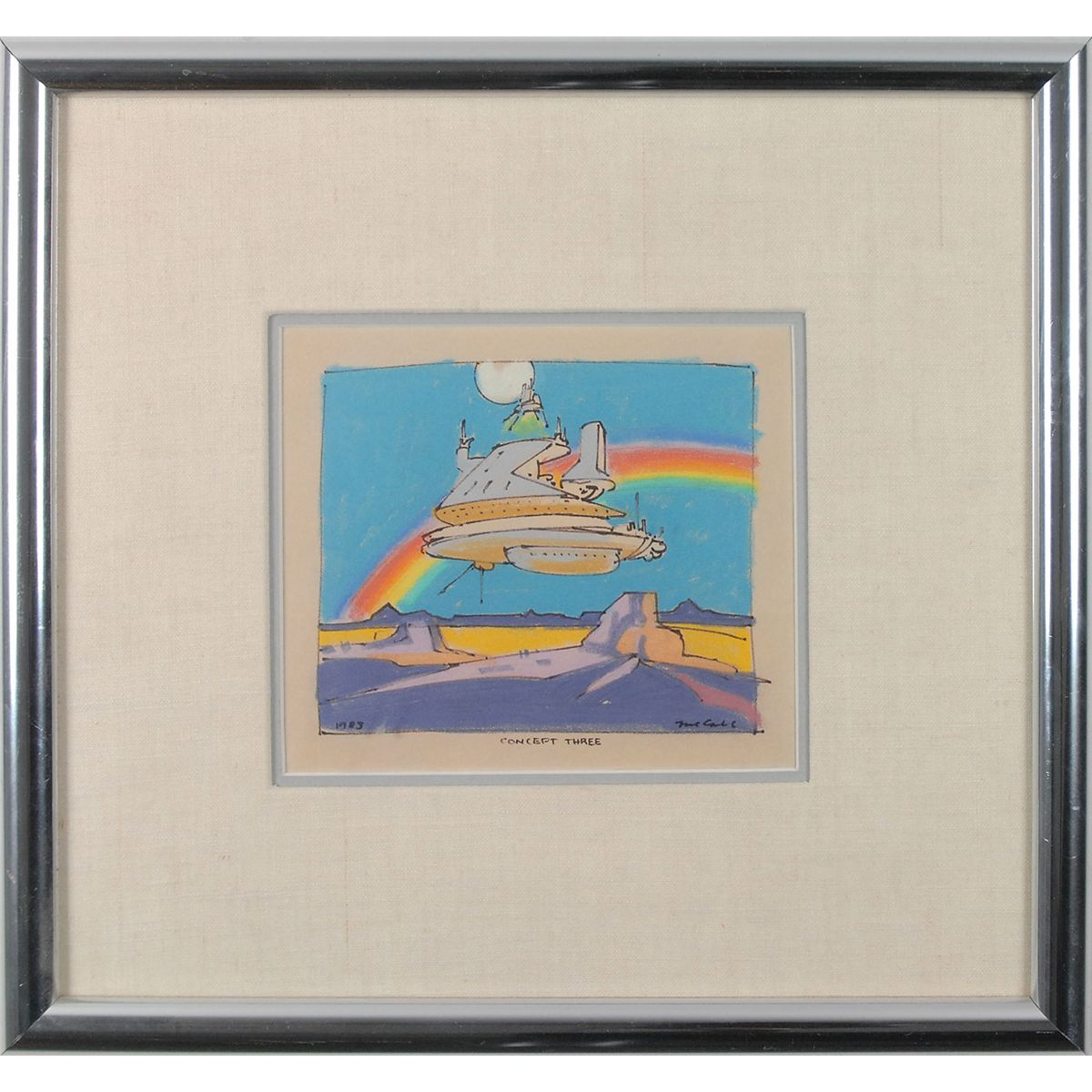 Vibrant color original ink and pastel drawing of a flying city over an alien landscape, 6.5 x 6, titled “Concept Three,” and signed in black ink, “1983 McCall.” Double cloth-matted and framed to an overall size of 13.75 x 13. In very fine condition.
