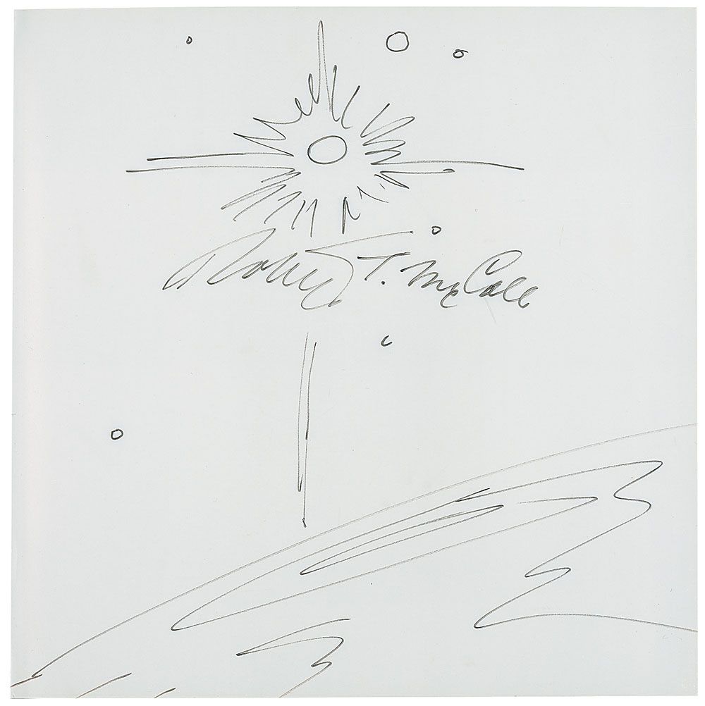 Signed book: The Art of Robert McCall: A Celebration of Our Future in Space, with an Introduction by Ray Bradbury. First edition, first printing. NY: Bantam Books, 1992. Hardcover with dust jacket, 11.5 x 11.5, 150 pages. Signed on the first free end page in black felt tip, with McCall adding a full page original sketch of a bright star shining over a planet. In fine condition, with scattered light wear and rubbing to dust jacket.