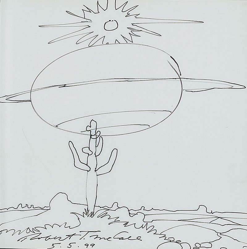 Signed book: The Art of Robert McCall. First edition, first printing. NY: Bantam Books, 1992. Hardcover with dust jacket, 11.5 x 11.5, 150 pages. Signed on the first free end page in black felt tip, “Robert T. McCall, 5-5-99,” adding a large sketch of a planetary landscape, with a large planet and sun in the sky. In fine condition.
