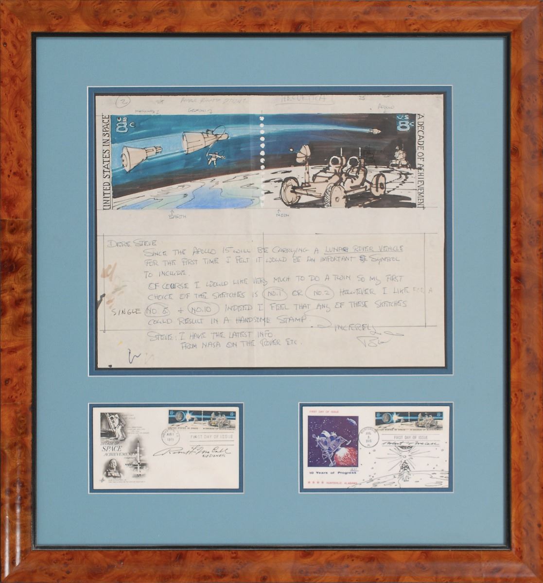 McCall’s preliminary artwork for his design of the memorable eight-cent United States ‘Decade of Achievement’ postage stamps issued in 1971, accomplished in colored marker and pencil on a white 15.5 x 12 sheet. On the same page, McCall writes an ALS signed “Bob,” explaining his thoughts on the design, in full: “Since the Apollo 15 will be carrying a Lunar Rover Vehicle for the first time I felt it would be an important symbol to include. Of course I would like very much to do a twin so my first choice of the sketches is No. 1 or No. 2 however I like for a single No. 5 & No. 10 indeed I feel that any of these sketches could result in a handsome stamp…I have the latest info from NASA on the Rover etc.” Matted and framed with two FDCs of the version of the stamp, each signed by McCall, with one featuring an additional lunar landing sketch. In fine condition.