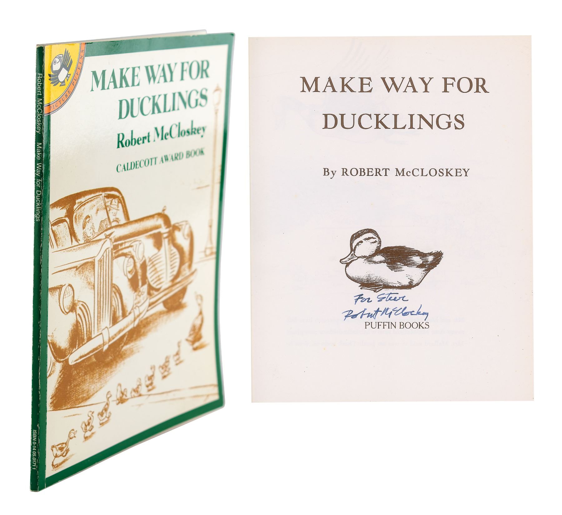 Signed book: Make Way for Ducklings. Later printing. NY: Puffin Books, 1976. Softcover, 7 x 9. Signed and inscribed on the title page in ink, "For Steve, Robert McCloskey." In fine condition.