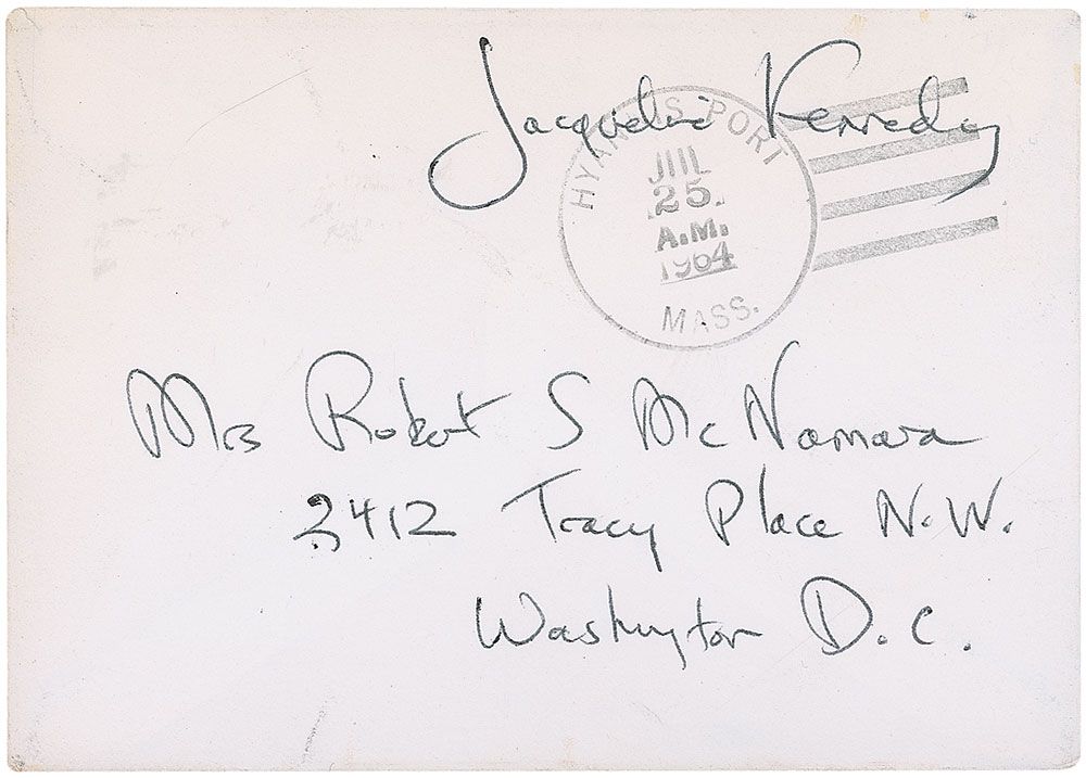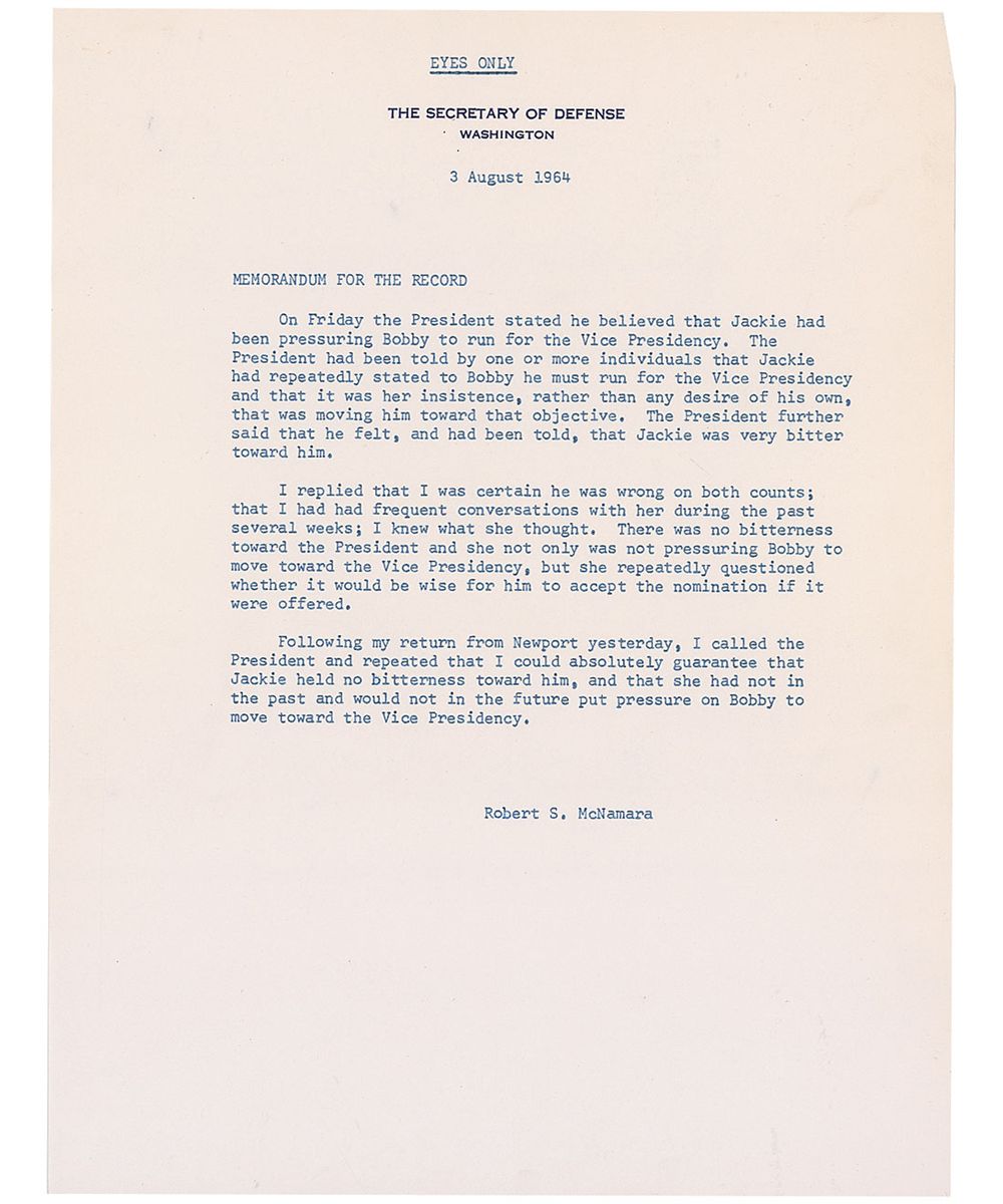 Private typed memo, signed in type, “Robert S. McNamara,” one page, 8 x 10.5, Secretary of Defense letterhead, August 3, 1964, and headed at the top, “Eyes Only, Memorandum For The Record.” Memo reads, in part: “On Friday the President stated he believed that Jackie had been pressuring Bobby to run for the Vice Presidency. The President had been told by one or more individuals that Jackie had repeatedly stated to Bobby he must run for the Vice Presidency and that it was her insistence, rather than any desire of his own, that was moving him toward that objective. The President further said that he felt, and had been told, that Jackie was very bitter toward him. I replied that I was certain he was wrong on both counts; that I had had frequent conversations with her.”; and a hand-addressed and free franked mailing envelope, 5.25 x 3.75, filled out by Jacqueline Kennedy to “Mrs. Robert S. McNamara, 2412 Tracy place N.W., Washington, D. C.,” and franked along the top, “Jacqueline Kennedy.” In fine condition, with some light wrinkles to memo. Just days before issuing this memo, Johnson announced that he would not recommend as a running mate any member of his cabinet. A highly insightful and revealing offering as McNamara attempts to keep the peace between the Kennedys and Johnson.