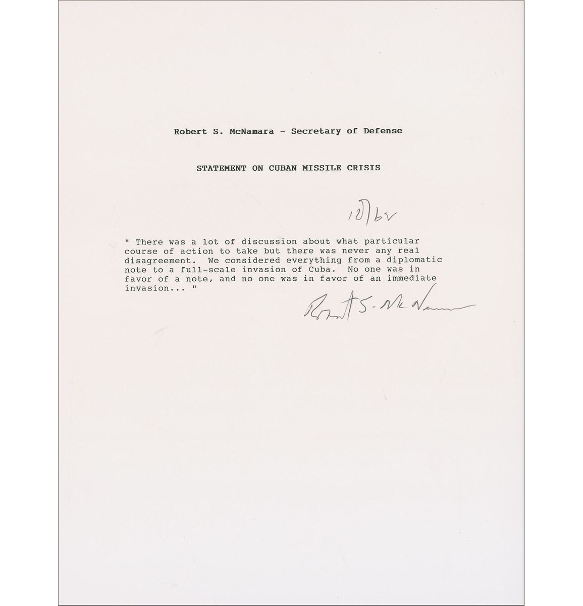 Two items: glossy 8 x 10 half-length photo, signed in blue ballpoint, “Robert S. McNamara”; and a TQS signed “Rob S. McNamara,” one page, 8.5 x 11. Quote from the Statement on Cuban Missile Crisis reads, in full: “There was a lot of discussion about what particular course of action to take but there was never any real disagreement. We considered everything from a diplomatic note to a full-scale invasion of Cuba. No one was in favor of a note, and no one was in favor of an immediate invasion…” In fine condition.