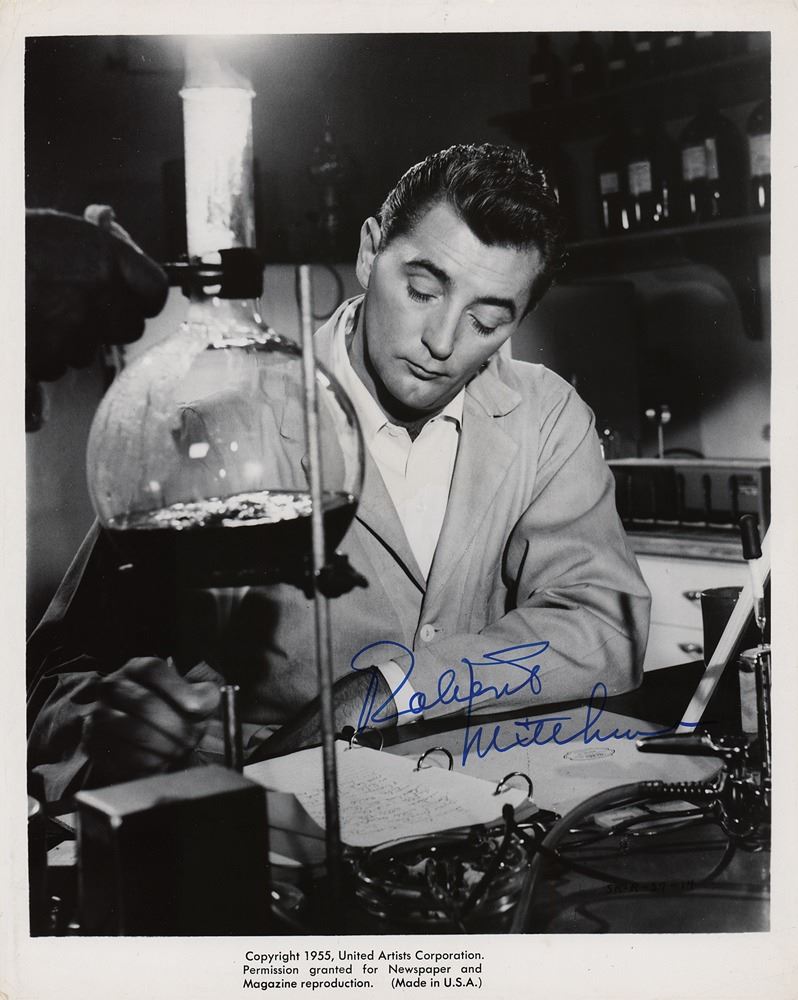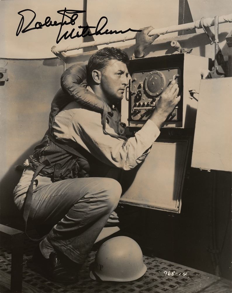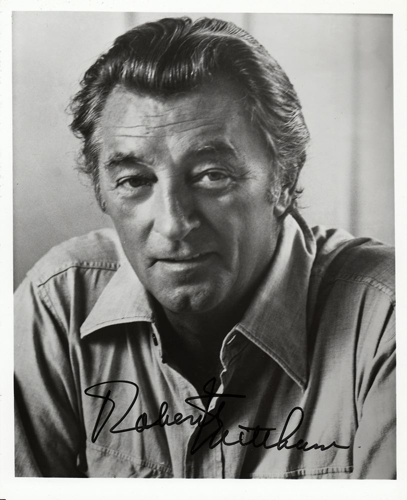 Three glossy photos of actor Robert Mitchum, ranging in size from 7.25 x 9.25 to 8 x 10, the latter depicting him in the 1955 film noir Not as a Stranger, all signed in either blue or black felt tip. In overall fine condition.