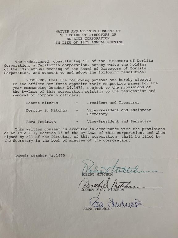 Robert Mitchum signed Dorlite Corporation 1975 annual meeting notes. HL5646