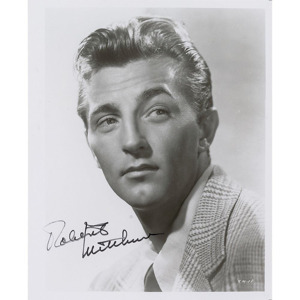 Attractive glossy 8 x 9.75 portrait of Mitchum from early in his acting career, signed in black felt tip. In fine condition.