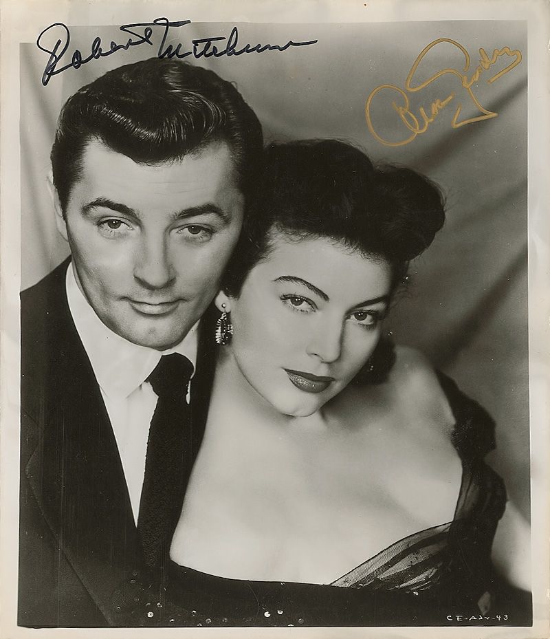 Glossy 8 x 10 photo of Mitchum and Gardner as they appeared in My Forbidden Past, signed in black felt tip by Mitchum and gold ink by Gardner. In very good condition, with some bends, creases, and irregular toning throughout, scattered surface impressions, and a couple dings to the right edge.