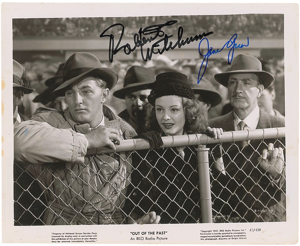 Glossy 10 x 8 promotional photo from Out of the Past, signed in black felt tip by Mitchum and in blue felt tip by Greer. In very good condition, with soiling along borders and scattered impressions and light creases.