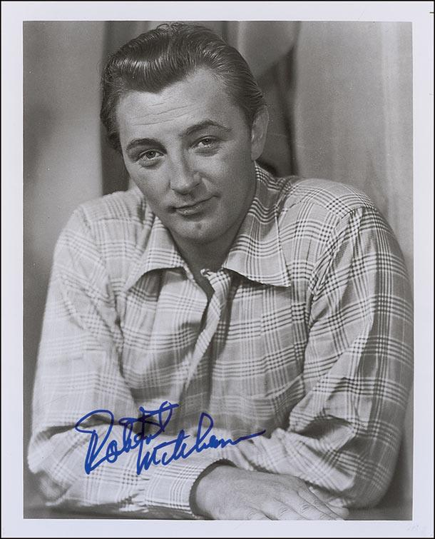 Glossy 8 x 10 photo of Mitchum posing in a plaid shirt, signed in blue felt tip. In fine condition, with light creasing to bottom corners.