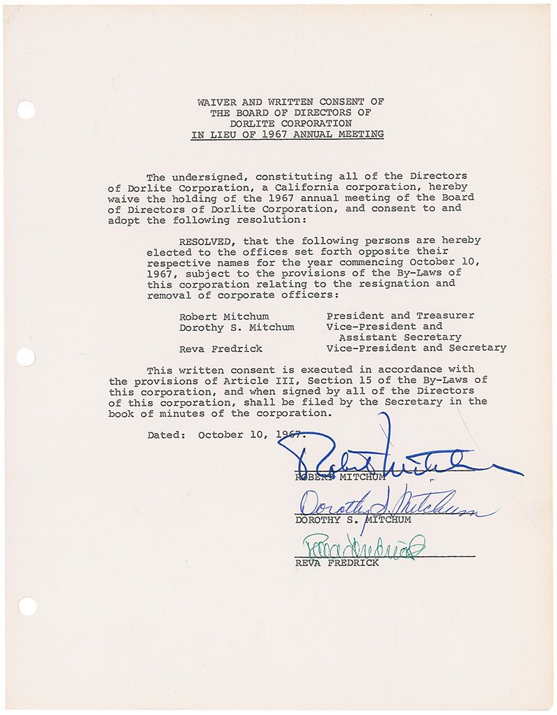DS, one page, 8.5 x 11, October 10, 1967. Waiver of the Board of Directors of the Dorlite Corporation “in lieu of 1967 annual meeting,” stating Mitchum was elected president and treasurer. Signed at the conclusion by Mitchum and also signed by the two other corporate officers including his wife Dorothy. In fine condition, with punch holes to left edge.